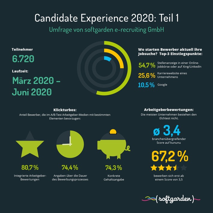 Der erste Teil der Candidate Experience 2020-Studie steht unter https://go.softgarden.de/candidate-experience-1 zum kostenlosen Download zur Verfügung. Der zweite Teil nimmt in den kommenden Wochen Prozessaspekte wie die gewünschte Dauer der Verfahren aus Kandidatensicht in den Blick sowie die Erlebnisdimension in Form von individuellen Insights der Jobsucher. Im abschließenden dritten Teil geht es um die jeweiligen Besonderheiten je nach Einstieg in die Jobsuche (Google, Jobbörse, Xing oder LinkedIn, Karrierewebsite).
