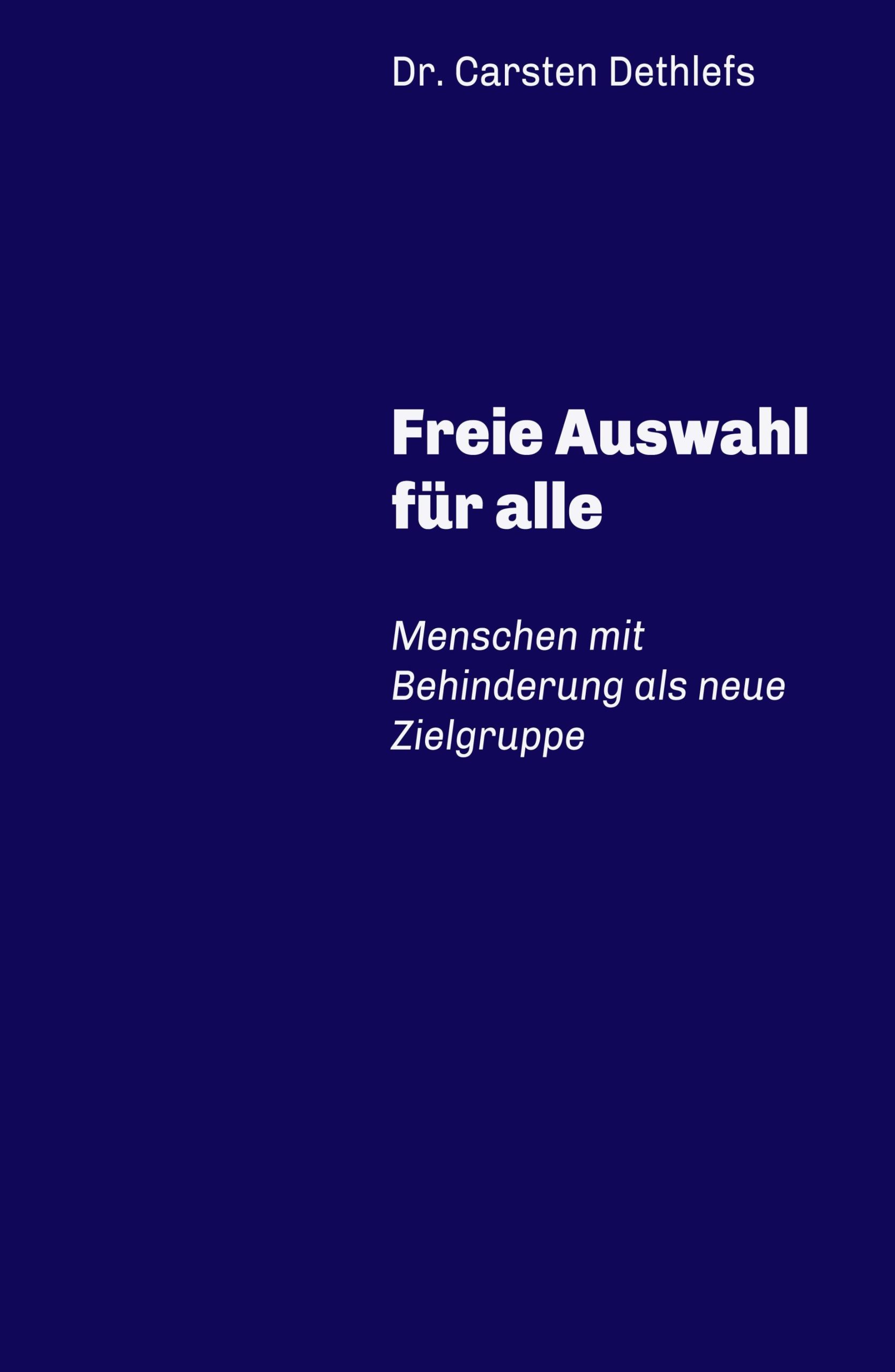 Unter Anderem anhand einer empirischen Erhebung versucht das Buch „Freie Auswahl für alle“ die Frage zu beantworten, wie man Menschen mit Behinderung nicht mehr nur länger als „Objekte des Mitleids“ wahrnehmen, sondern sie als neuen Markt, als neue Zielgruppe, entdecken kann. Denn eine gedankliche und praktische Umpositionierung von Menschen mit Behinderung würde letztlich allen zugutekommen. Falsches Mitleid ist hier fehl am Platz. Die frischen Ideen in „Freie Auswahl für alle“ von Carsten Dethlefs beweisen, dass eine gedankliche und praktische Umpositionierung von Menschen mit Behinderung letztlich allen zugute kommen würde. Das Buch bietet Anhaltspunkte und viel Material für anregende Diskussionen. Es geht um eine Gesellschaft, in der kein Mensch am Rande liegen gelassen wird und in der Behinderungen, sichtbar und unsichtbar, als Chance und nicht als Problem gesehen werden. Wer sich informieren möchte, wie so etwas geht, findet in diesem Buch reichlich Ansatzpunkte und Diskussionsstoff.