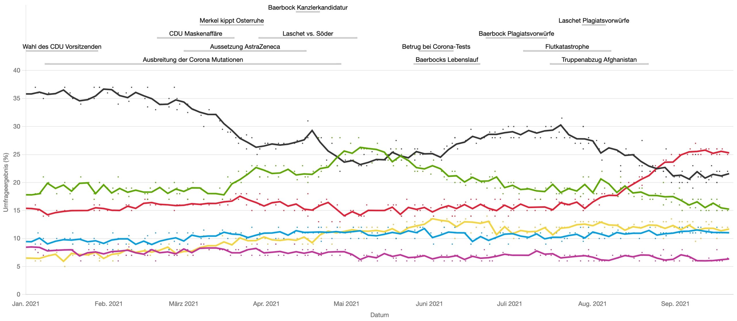 Auf der Seite können Benutzer*innen in einer interaktiven Übersicht die Umfragewerte und Ereignisse gleichermaßen betrachten. Zu jedem Ereignis können direkt passende Nachrichtenartikel aus den genannten Quellen eingesehen werden.