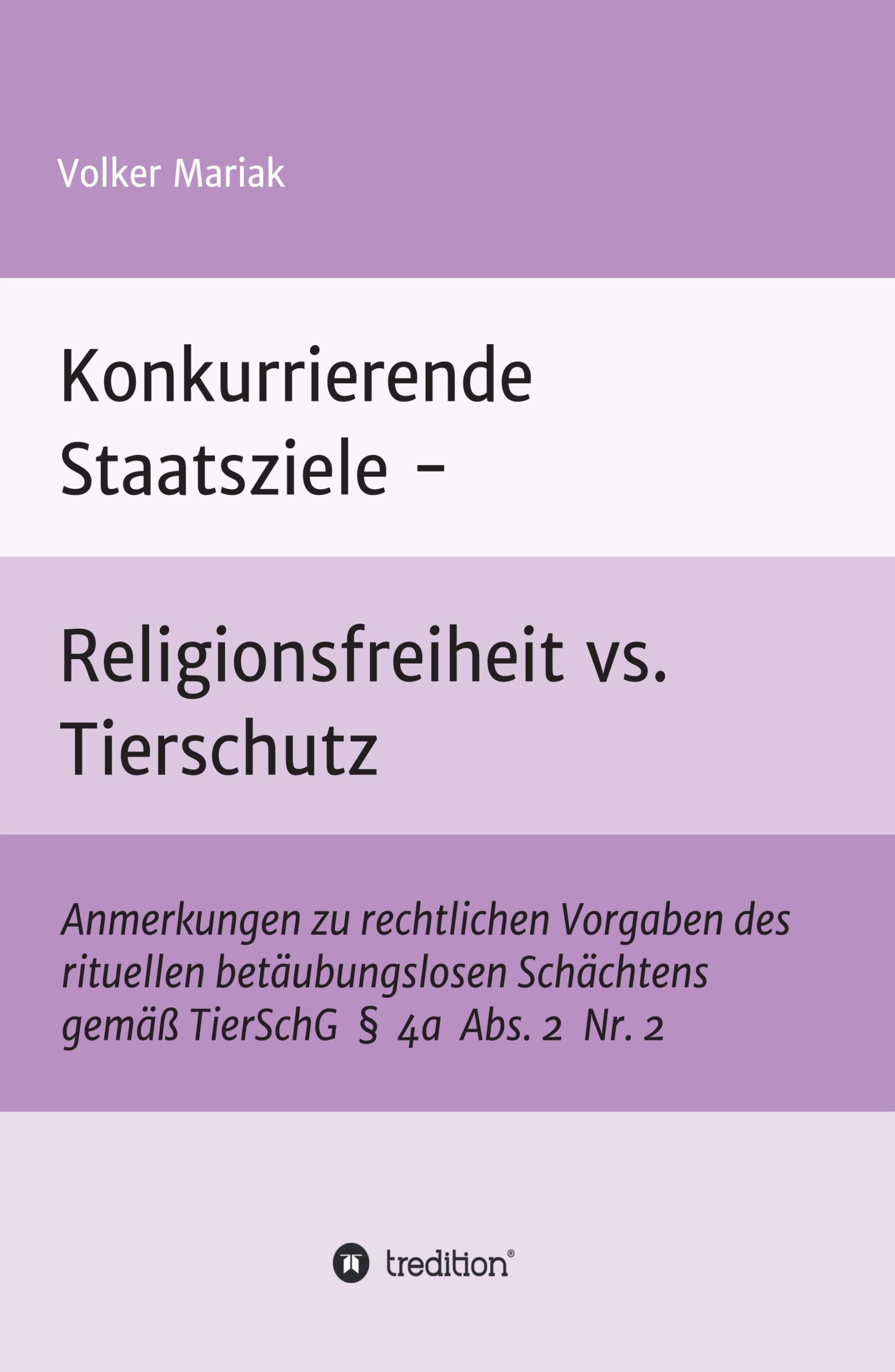 „Konkurrierende Staatsziele – Religionsfreiheit vs. Tierschutz“ von Volker Mariak ist ab sofort im tredition Verlag oder alternativ unter der ISBN 978-3-7345-5954-9 zu bestellen. Der tredition Verlag hat es sich zum wichtigsten Ziel gesetzt, jungen und unbekannten Autoren die Veröffentlichung eigener Bücher zu ermöglichen, aber auch Verlagen und Verlegern eine Kooperation anzubieten. tredition veröffentlicht Bücher in allen Medientypen, vertreibt im gesamten Buchhandel und vermarktet Bücher seit Oktober 2012 auch aktiv.