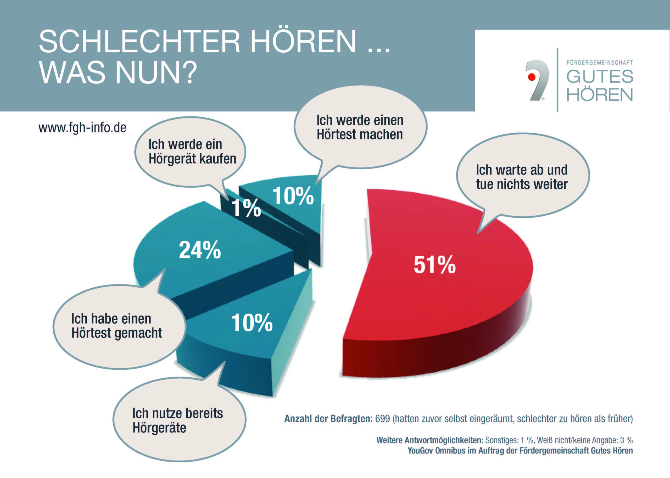 Die Fördergemeinschaft Gutes Hören steht für systematische Hörprävention und Aufklärungsarbeit. Als Hörexperten vor Ort stehen allen Interessierten die rund 1.500 FGH Partnerakustiker zur Verfügung. Bei ihnen wird das gesamte Leistungsspektrum vom kostenlosen Hörtest über Auswahl, Anpassung und Programmierung geeigneter Hörgeräte bis hin zur mehrjährigen Nachbetreuung angeboten. Die FGH Partner sind zu erkennen am Ohrbogen mit dem Punkt. Einen Fachbetrieb in der Nähe findet man unter www.fgh-info.de
